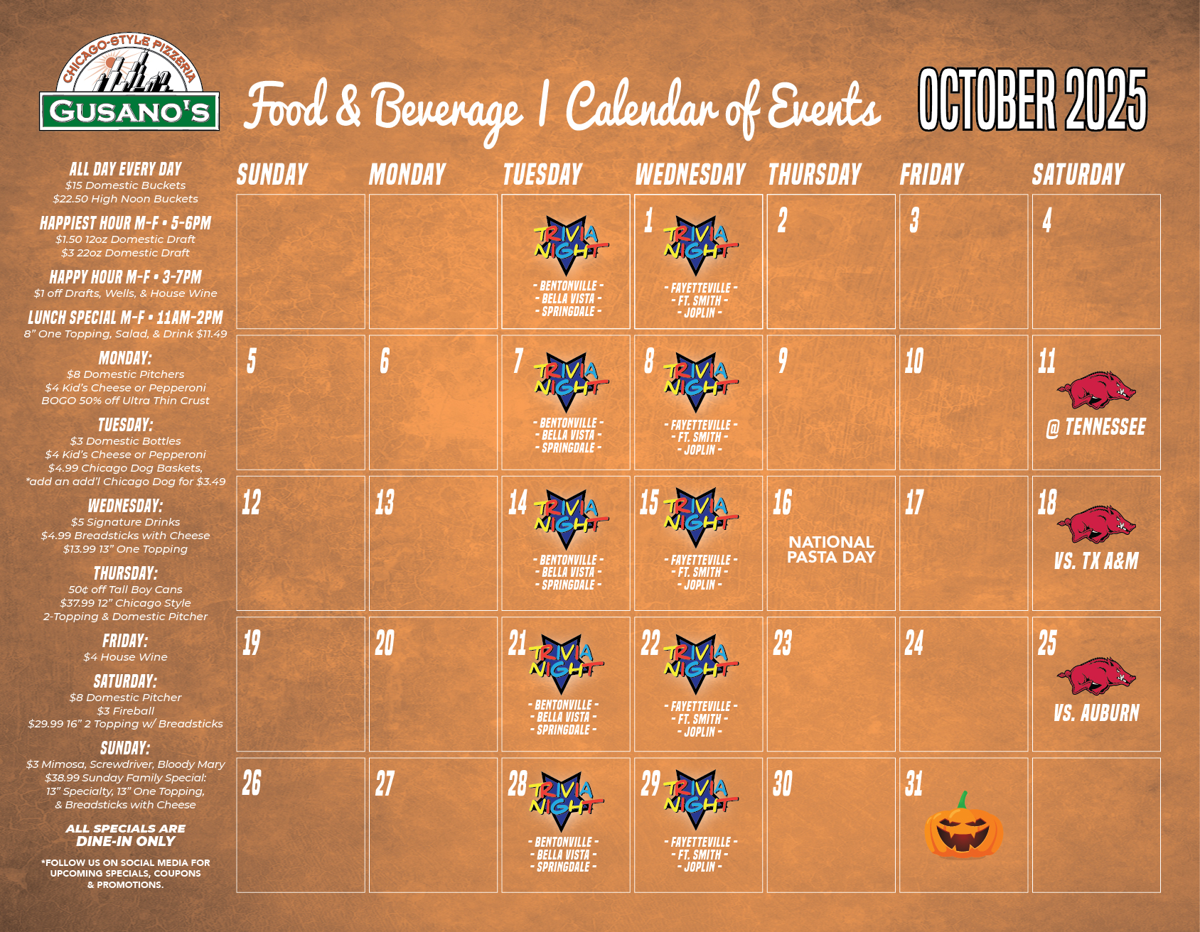 With success in Bentonville and Bella Vista, the owners wanted to open a Gusano’s near the University of Arkansas and opened the Fayetteville store in 2008. Due to the demand of Gusano’s pizza in Fayetteville, the owners needed to expand, therefore, moving the store to it’s new location on Steamboat Dr. in 2012. Our kid friendly location is close to the Girls & Boys Club of Fayetteville, so bring the kids by after a full day of activities! With plenty of tables, and a large parking lot, the Fayetteville location can accommodate large Razorback game day crowds.